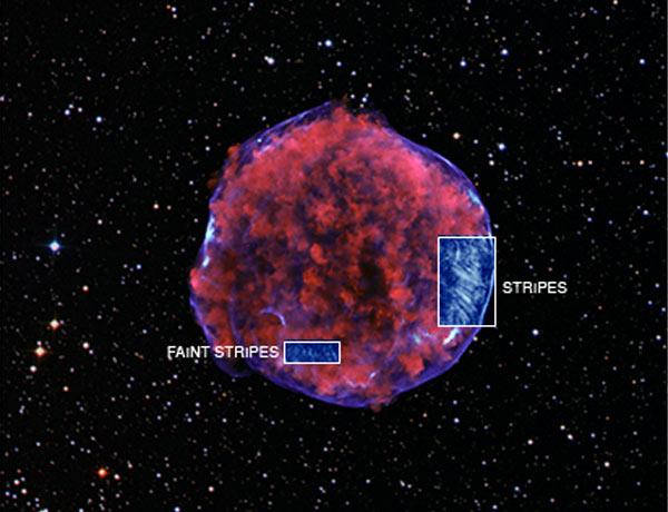 Successivamente, il telescopio spaziale Chandra riuscì ad ottenere immagini X dalla risoluzione ancor più straordinaria nelle quali erano presenti alcuni particolari mai osservati prima in altri oggetti simili: strisce radiali poste nella parte esterna dell’anello in espansione, quasi a contatto con suo bordo. Si ritiene che queste siano formate laddove le linee di forza del campo magnetico presente nel onda d’urto del residuo risultano più intricate rispetto alle aree circostanti; qui, elettroni dall’energia almeno 100 volte maggiore di quelle riproducibili al Large Hadron Collider gli elettroni si muoverebbero spiraleggiando proprio intorno tali linee di forza la cui reciproca distanza sarebbe in relazione proprio all’energia del loro moto ricurvo. Il tutto non è certamente di poco conto, visto che tali tracce spiegherebbero una delle modalità con cui si formano i raggi cosmici, quelle particelle ad alta energia che bombardano la Terra provenendo dallo spazio profondo.