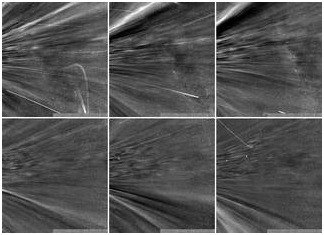 Gli pseudostreamer si vedono come scie luminose che si spostano verso l’alto nelle immagini superiori e inclinati verso il basso nella riga inferiore.