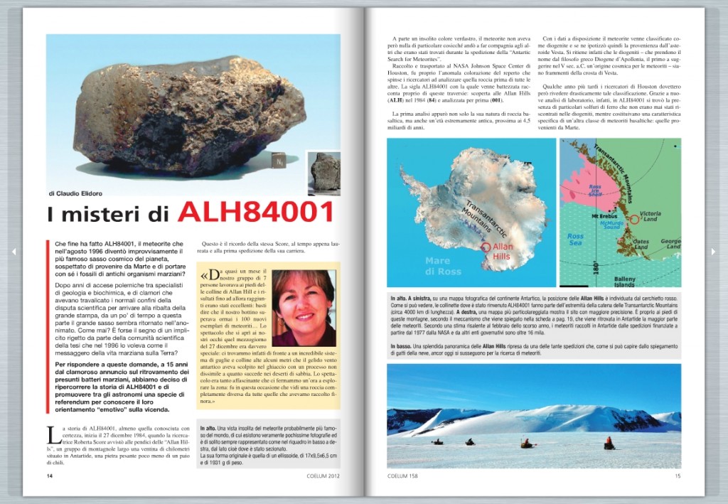 | Coelum – Quale idea si è fatta della lunga diatriba sulle presunte tracce biologiche nel meteorite marziano ALH84001? E’ solo uno sterile cavillare oppure al fondo vi è qualcosa di importante? |