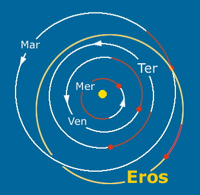 L’immagine a sinistra riporta l’orbita di (433) Eros rispetto a quella dei pianeti interni. I tratti rossi individuano i tratti percorsi durante i mesi di luglio e agosto.