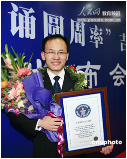 Se da una parte esistono i poeti di π, che forniscono i testi adatti alla memorizzazione delle sue cifre, dall’altra esistono i recordmen dello sport dell’apprendimento mnemonico. L’attuale detentore del primato è il cinese Lu Chao, che nel 2006, in una stupefacente performance, riuscì a recitare a memoria ben 67.890 cifre decimali del numero di Archimede, impiegando 24 ore e 4 minuti: secondo quanto riferì, aveva imparato a memoria le prime 100.000 cifre, ma alla 67.891-esima commise un fatale errore, dicendo “5” anziché “0”.