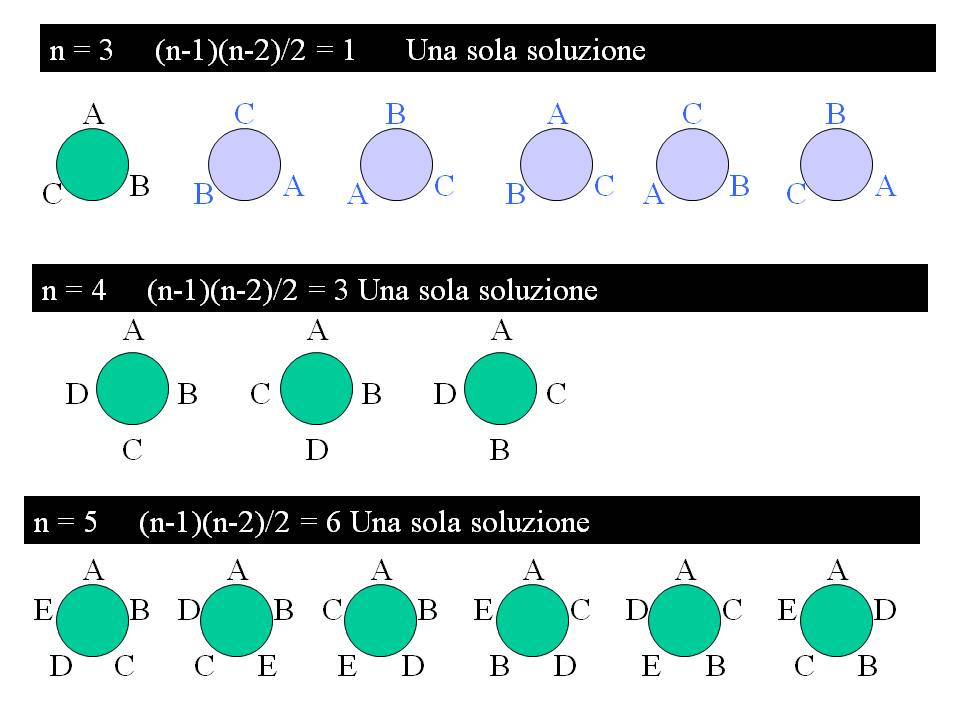 Con n = 4 abbiamo (n-1)(n-2)/2 = (4-1)(4-2)/2 = 3 disposizioni possibili.