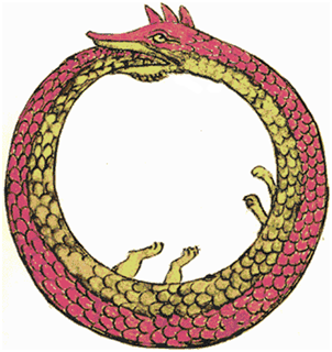 L’uroboro, il drago immaginario illustrato in figura qui a destra, è un simbolo dell’autoreferenza perché è sempre raffigurato mentre morde la propria coda. Qualcosa di simile alle Mani che disegnano del grafico olandese Maurits Cornelis Escher, celebre per le sue geometrie impossibili e per i suoi disegni vertiginosi (immagine in alto in apertura di articolo).