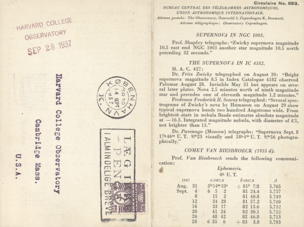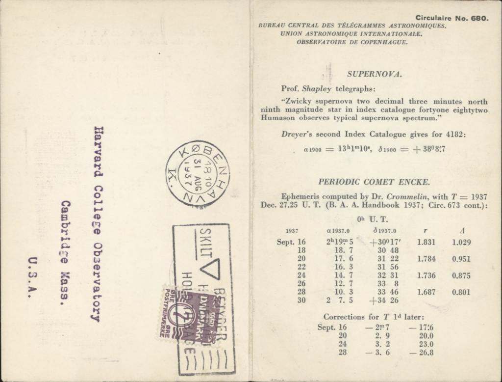 La nostra passione per le supernovae è sollecitata da piccoli misteri di questo tipo così come prima cosa contattammo il responsabile delle circolari IAUC Daniel Green il quale, molto disponibile, ci ha fornito velocemente quelle originali del 1937. La prima circolare che menziona la supernova è la n. 680 del 31 agosto 1937, essa comunica la scoperta da parte di Zwicky, riportando la posizione precisa, ma senza indicare la data dell’avvistamento.