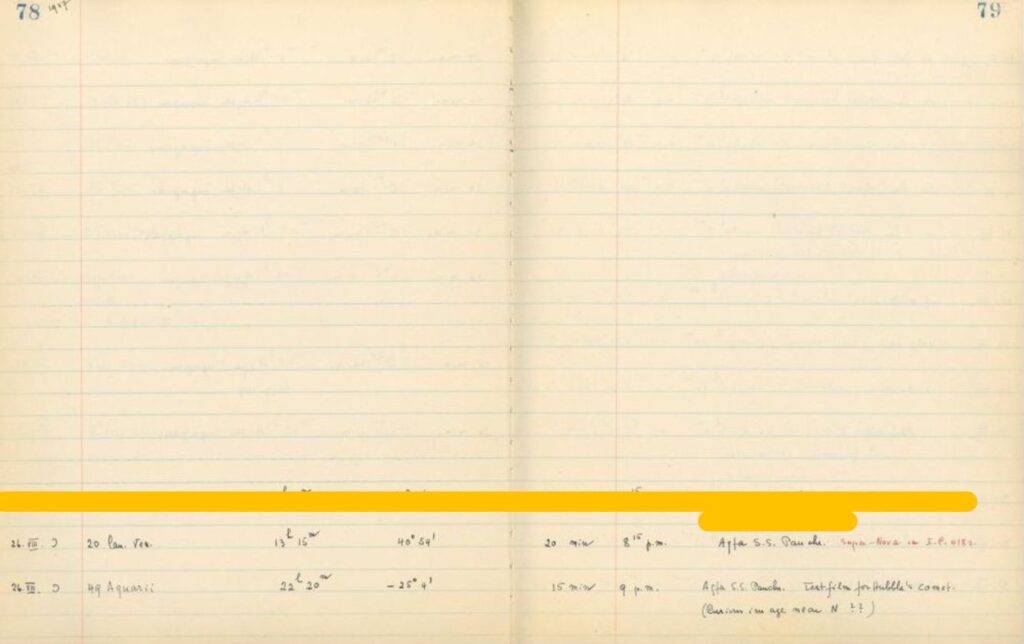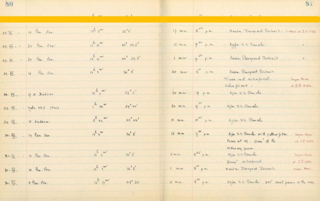Alle pagine 80 e 81 di questo vecchio libro scorgiamo le note del 28 agosto menzionate poi nella circolare n. 683, ma la nostra attenzione fu catturata dalle due pagine precedenti 78 e 79 in cui vennero trascritti altri dettagli delle riprese sulla galassia IC4182 ed è nella prima delle due pagine che è di fatto citata la scoperta della supernova con data 25 agosto 1937 alle ore 8,15 p.m., tempo di posa di 20 minuti su pellicola Agfa Super Panchromatic.