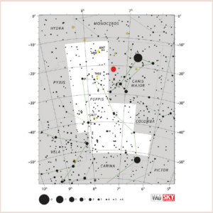 Per rintracciarla, nella parte più settentrionale della costellazione della Poppa, potremo prendere come punti di riferimento la stella Sirio del cane Maggiore e spostarci di una decina di gradi verso est, in una zona famosa per la presenza della nebulosa “Snowman”, o anche “Pupazzo di neve”.