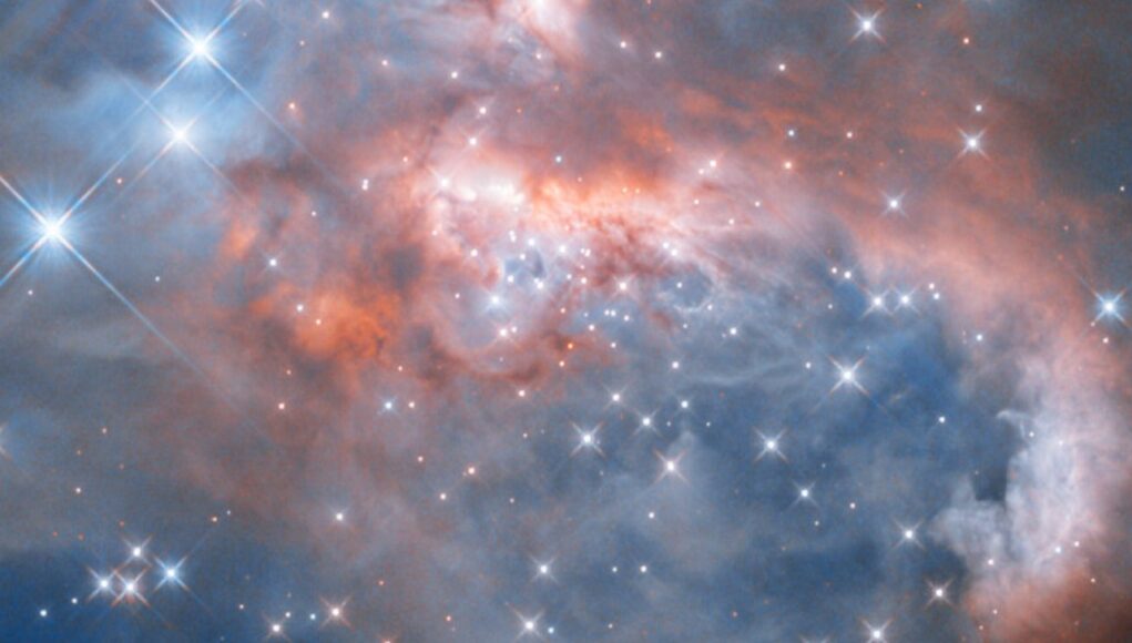 Luci stellari come brillantini sparsi in un cielo azzurro in cui si addensano a tratti nubi tempestose: è la turbolenta regione di formazione stellare RCW 7, soggetto di questa straordinaria ripresa del telescopio Hubble. RCW 7 è una vasta nebulosa ricca di gas e polveri interstellari. Ospita stelle in formazione particolarmente massicce, capaci di emettere forti radiazioni ultraviolette e impetuosi venti stellari, che illuminano e modellano il materiale circostante, trasformando questo insieme di nubi cosmiche in una variopinta regione HII.