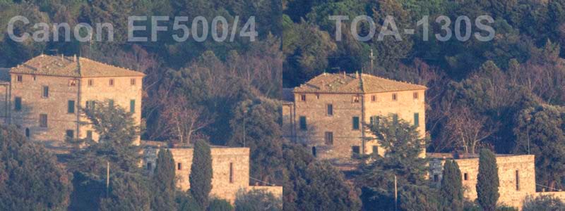 Ho confrontato fotograficamente il TOA-130 con il Canon EF500 f/4L Is (17 lenti in 13 gruppi) con duplicatore 2x, per capire se il supertele Canon potesse rappresentare una alternativa valida e più pratica nella fotografia di fenomeni tipo le eclissi e le congiunzioni.