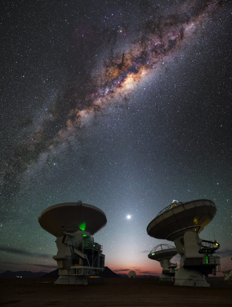 “Anche in assenza di punti di riferimento terrestri è spesso possibile individuare quando il Sole o la Luna sono stati aggiunti artificialmente confrontandoli con altri oggetti celesti. Ad esempio, l’immagine in basso a sinistra è spesso condivisa sui social media come una vera e propria fotografia di un’eclissi solare vista dallo spazio. Si tratta infatti di un’immagine generata al computer dall’artista A4size-ska , che la rivela apertamente come tale. Uno degli indizi è che il Sole e la Luna non sono affatto grandi rispetto alla Via Lattea, che puoi vedere appena sotto il “Sole eclissato” nell’immagine. Confrontandola con una fotografia reale che mostra la Via Lattea nel cielo (a destra), scattata all’Atacama Large Millimeter/submillimeter Array (ALMA) non è difficile notare le reali proporzioni”.
