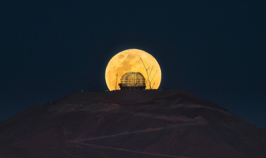 Mettiamolo alla prova con le immagini ELT sopra. La cupola dell’ELT è larga 88 m, mentre il Sole e la Luna sono poco più del doppio – circa 200 m. Moltiplicandolo per 100 si ottiene una distanza di tiro di 20 km. Questa è infatti la distanza tra il Cerro Armazones, dove si trova l’ELT, e l’Osservatorio Paranal dell’ESO, da dove sono state scattate queste immagini.