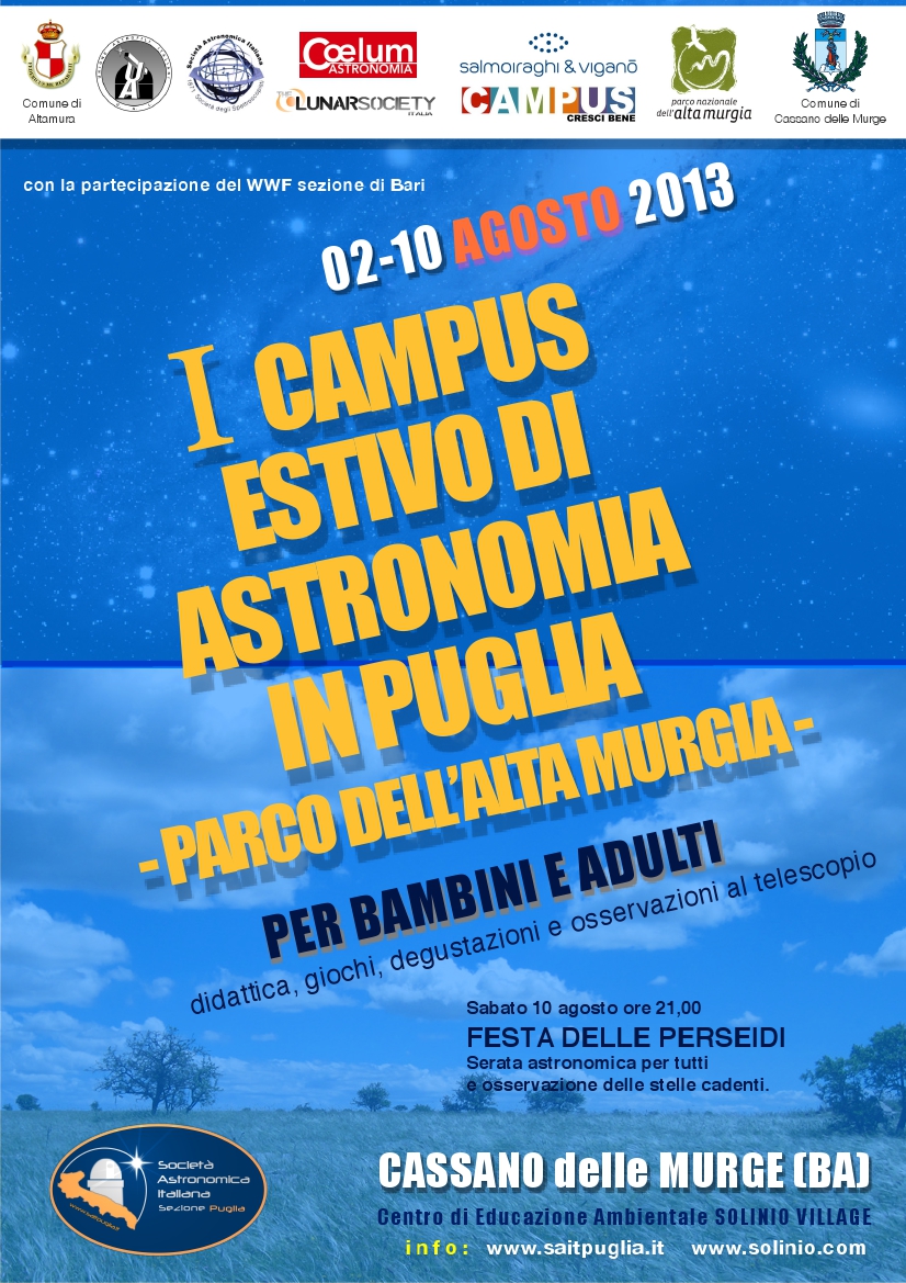 Dal 2 al 10 agosto 2013 si svolgerà nel Parco Nazionale dell’Alta Murgia, presso il CEA Solinio Village di Cassano delle Murge (Ba), il I Campus estivo di Astronomia in Puglia, una iniziativa didattica e divulgativa aperta a bambini, giovani e adulti promossa dalla Società Astronomica Italiana Sezione Puglia (Saitpuglia) in collaborazione con Unione Astrofili Italiani, Coelum Astronomia, Campus Cresci Bene di Altamura, The Lunar Society e Salmoiraghi e Viganò.