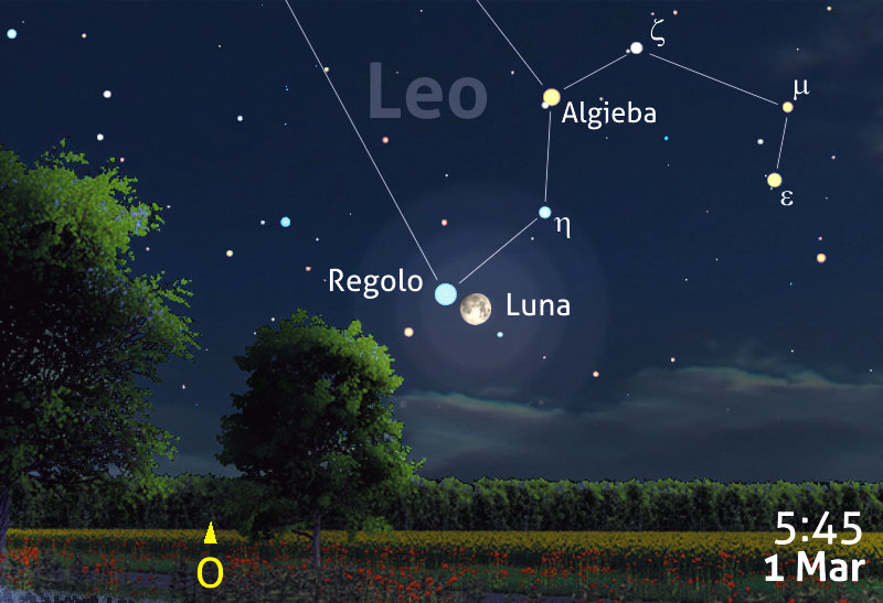 Appena il chiarore del crepuscolo lo permetterà, apparirano sull'orizzonte ovest una sottilissima falce di Luna, Regolo e il brillante Venere (sicuramente il primo ad apparire), potremo osservarli però solo fin verso le 22, prima che tramontino dietro l'orizzonte.