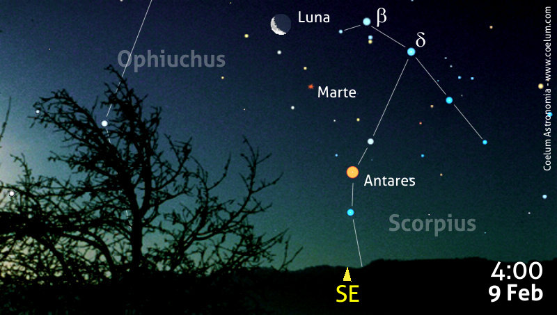 Marte e Antares si reincontrano nel cielo del mattino, raggiunti da un bella falce di Luna.