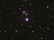 La nebulosa a riflessione GN 04.32.8, nella Nube Molecolare del Toro a 480 anni luce, mostra un arco azzurro illuminato da tre giovani stelle, tra cui V1025 Tauri e HP Tauri. Le polveri diffondono la luce blu, mentre una protostella con disco protoplanetario emerge in basso. L’oggetto è debole ma osservabile in inverno con strumenti adeguati.