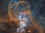 Nel progetto ShaRA#12 il team ha elaborato l’immagine della nebulosa NGC 3576, detta “Statua della Libertà”, utilizzando dati LRGB e banda stretta SHO. Grazie a 69 ore di acquisizione da un telescopio in Cile, ogni membro ha proposto una resa cromatica personale. Il superstack finale restituisce una visione spettacolare della nebulosa in Hubble palette.