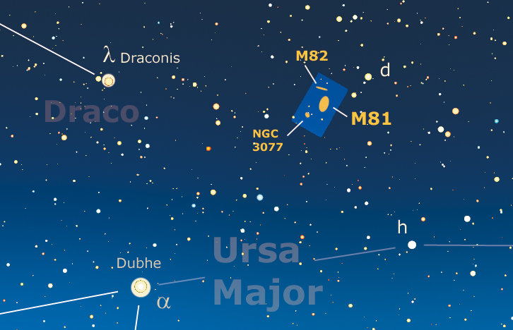 La cartina del mese è centrata sulla parte settentrionale della costellazione dell’Orsa Maggiore, dove circa 10° a nordovest della stella alfa Dubhe (mag. +2) e 1,9° ad est della stella δ Ursa Majoris (mag. +4,5) si trova il terzetto di galassie M81, M82 e NGC 3077.