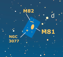 La cartina del mese è centrata sulla parte settentrionale della costellazione dell’Orsa Maggiore, dove circa 10° a nordovest della stella alfa Dubhe (mag. +2) e 1,9° ad est della stella δ Ursa Majoris (mag. +4,5) si trova il terzetto di galassie M81, M82 e NGC 3077. Il rettangolo di cielo più chiaro che racchiude i tre oggetti identifica la regione ingrandita nella foto succesiva.