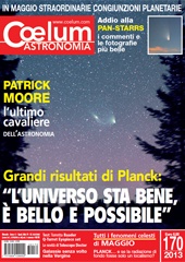 Copertina del mese dedicata alla Pan-Starrs che si sta allontanando dalla Terra, ma il grande titolo che parla del satellite Planck (la bellissima citazione tra virgolette è del fisico Antonio Masiero) fa capire che gran parte della scena gli è rubata dai nuovi dati che arrivano dall’inizio dell’universo visibile; numeri che confermano il Big Bang e aprono nuovi scenari non privi di qualche incertezza. Nella foto, la congiunzione tra M31 e la cometa ripresa il 4 aprile dal finlandese Erkki-Rauhala-Maisema.
