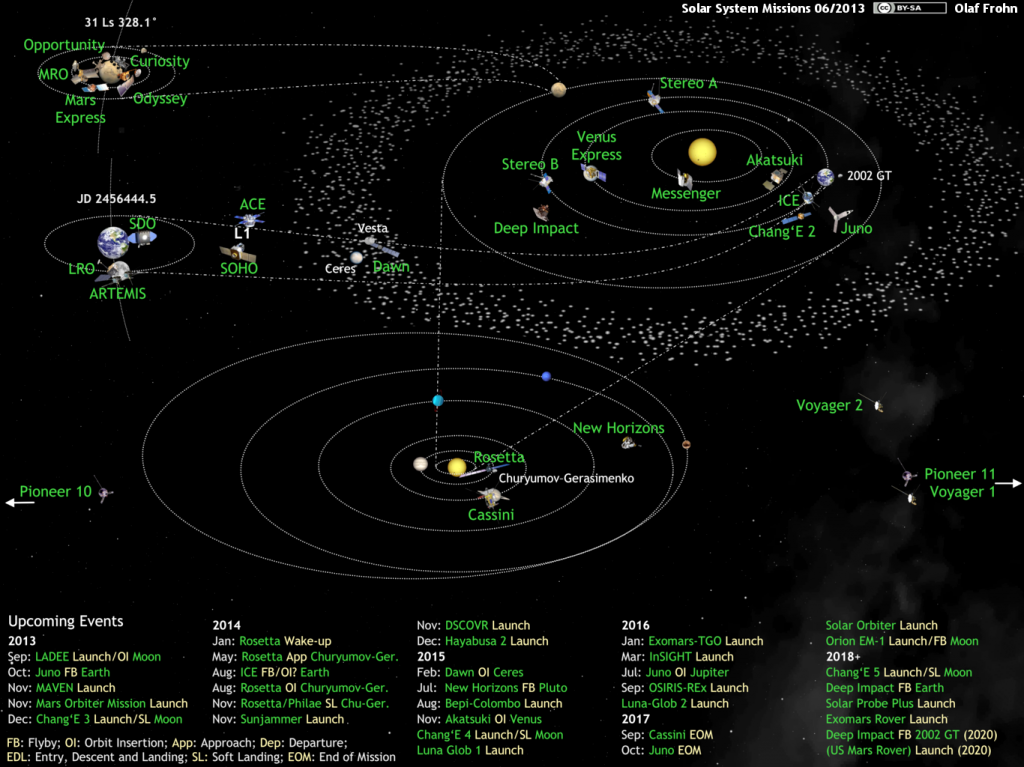 Percorrendo l’immagine, dal centro verso l’esterno, pianeta per pianeta, appare chiara la presenza di una flotta di piccole sonde americane ed europee attualmente attive, intorno a quasi tutti i corpi planetari.