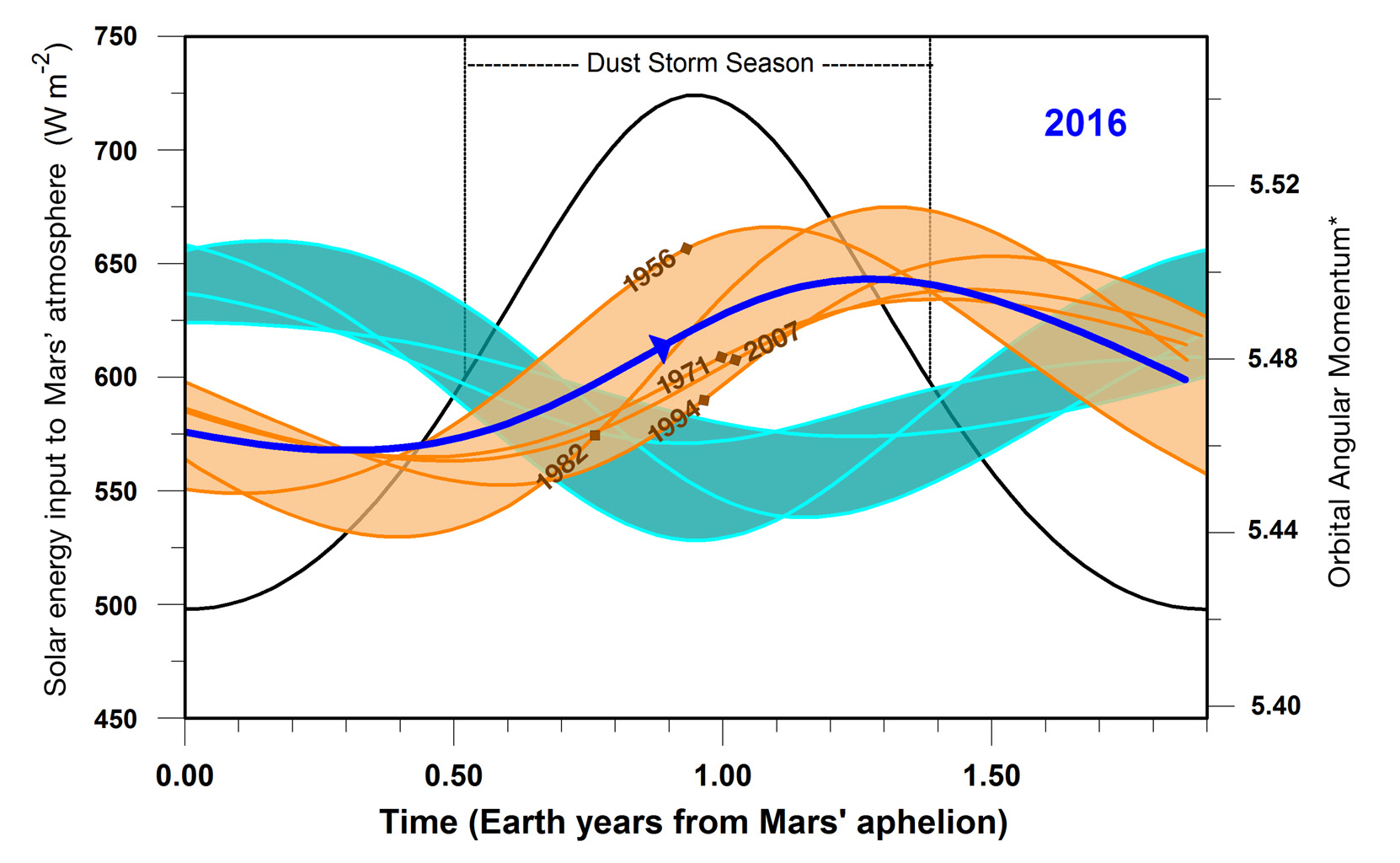 Ciò che Shirley notò, nel suo lavoro del 2015, fu che, considerando anche gli altri pianeti, emergeva una correlazione fra il verificarsi di tempeste di polvere globali e il moto orbitale di Marte. Altri pianeti hanno infatti un effetto sul momento angolare di Marte nella sua rivoluzione attorno al Sole. Un effetto modulato secondo un ciclo di circa 2.2 anni, dunque superiore al periodo orbitale del pianeta, lungo circa 1.9 anni. La relazione tra questi due cicli varia continuamente. Ebbene, Shirley ha scoperto che le tempeste di polvere globali tendono a verificarsi quando il momento angolare è in aumento durante la prima parte della stagione delle tempeste di polvere. Viceversa, almeno fra quelle conosciute, nessuna delle tempeste di polvere globali si è verificata negli anni in cui, durante la prima parte della stagione delle tempeste di polvere, il momento angolare era in calo.