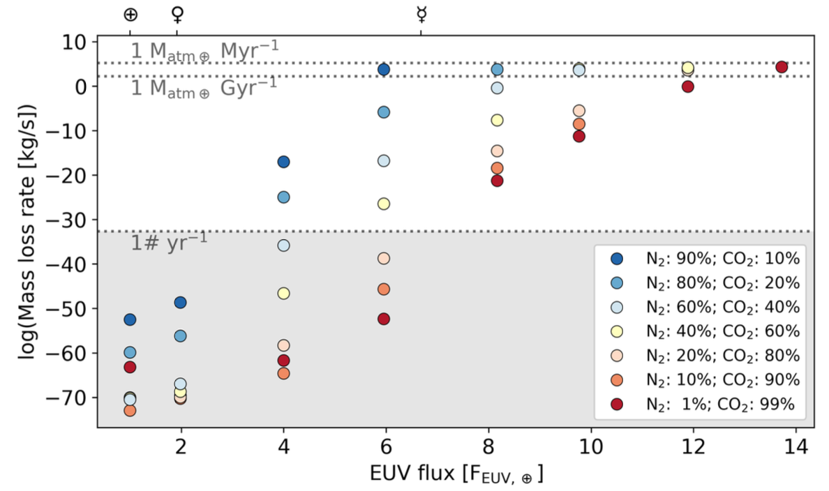 Per un pianeta di massa uguale alla Terra si trova che la fuga di Jeans è trascurabile al di sotto di 6 FEUV,⊕ indipendentemente dalla composizione atmosferica calcolata mediante i suddetti rapporti percentuali, risultato che ben si accorda con le predizioni teoriche, secondo cui la perdita di atmosfera cresce proporzionalmente alla quantità di energia radiativa assorbita. Di conseguenza, la probabilità che un pianeta ricevente un flusso radiativo maggiore di 6 FEUV,⊕ perda una parte consistente della propria atmosfera è elevata. Si stima che il livello di irraggiamento odierno di TRAPPIST-1 dovrebbe portare alla perdita dell’atmosfera dei 4 pianeti nella zona abitabile nel giro di qualche miliardo di anni, e che quelli più interni siano già stati privati di atmosfera in passato a causa dell’eccessiva vicinanza alla stella. Da ciò si conclude allora che nessuno dei pianeti di TRAPPIST-1 sopravviverà alla perdita di atmosfera per meccanismo termico di fuga di Jeans.