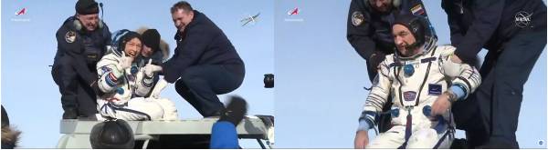 Dopo essersi staccata dalla ISS alle 6:50, ora italiana, alle 10:12 la Soyuz, aperti correttamente i paracadute, ha toccato terra, nel bel mezzo delle steppe del Kazakistan ricoperte da 30 cm di neve. Dopo pochi minuti lo sportello si è aperto e ne sono usciti, sani, salvi e sorridenti il nostro Luca Parmitano e i suoi compagni di viaggio Christina Koch della NASA e Aleksandr Aleksandrovič Skvorcov della Roscosmos.