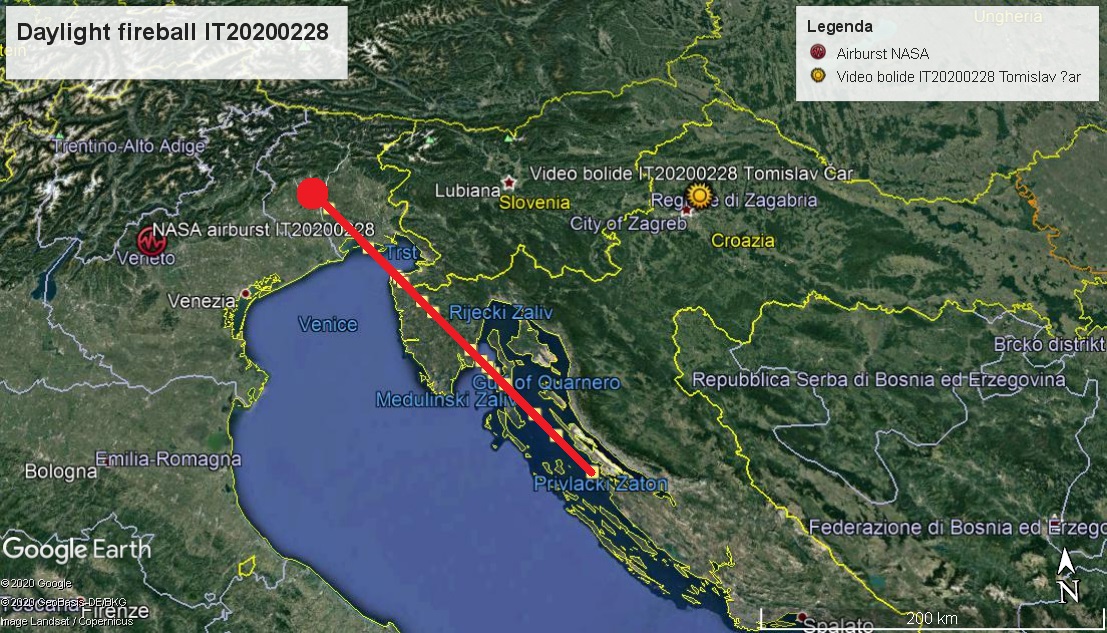 Aggiornamento del 29.02.2020: avvalendoci dei dati resi disponibili dai satelliti militari statunitensi e includendo anche osservazioni visuali dall’ex Jugoslavia, abbiamo affinato l’orario dell’evento (inizialmente avevamo riportato 09:35:25 UT) e l’immagine con la traiettoria del bolide. Fonte: progetto Prisma
