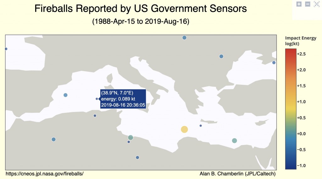 Sul sito Cneos è disponibile un database che indica quasi ottocento bolidi (in inglese fireball) registrati dal 1988 a oggi. Una media di 25 all’anno in tutto il mondo. Quello passato pochi giorni fa sulla Sardegna, con la potenza di meno di 0,1 chilotoni, non è certamente tra i bolidi più “energetici” finora registrati, ma rappresenta comunque – come mostra la mappa riportata qui sopra – uno dei pochi nel Mediterraneo e il primo in Italia.