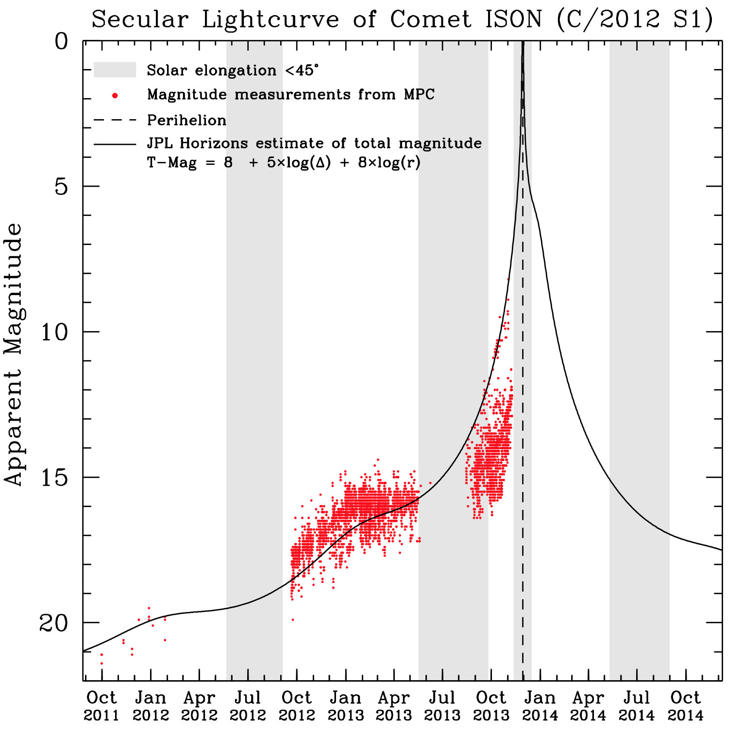 La ISON sta diventando sempre più luminosa ed è adesso visibile anche con binocoli. Una novità importante arriva dall’astronomo Emmanual Jehin, dell’Università di Liegi, Belgio, che ha annunciato di aver osservato i segni di un’outburst nella cometa ISON, che avrebbe portato ad una produzione di gas (H2O, CO2, etc) fino al doppio maggiore rispetto al giorno prima, ma potrebbe anche essere un brutto segno, un indizio del fatto che la cometa si starebbe disintegrando.