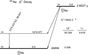 Del Sodio 22 non si ha invece alcuna traccia. Questo radioisotopo decade beta a causa del suo tempo di dimezzamento (τ=2,6 anni) si presterebbe a una facile identificazione in osservazioni con telescopi satellitari. Si potrebbe infatti rivelare senza difficoltà la riga di diseccitazione del Neon 22 (transizione dallo stato 2+ allo stato 0+ in Fig. 3), prodotto nel decadimento beta. Il nucleo di Neon 22, è prodotto nel suo stato eccitato 2+ che a sua volta decade gamma sullo stato fondamentale, emettendo un fotone da 1,27 MeV [9].