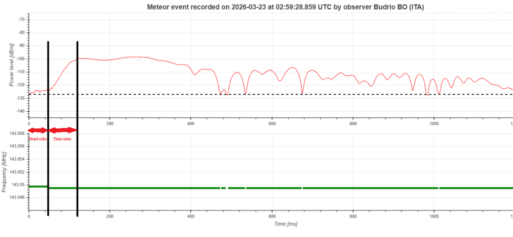 Durante l’attraversamento della prima zona di Fresnel, il meteoroide produce progressivamente ionizzazione, portando il segnale da un livello nullo fino al massimo dell’eco osservato. Il tempo impiegato in questo attraversamento viene definito time rise (tempo di salita del segnale)