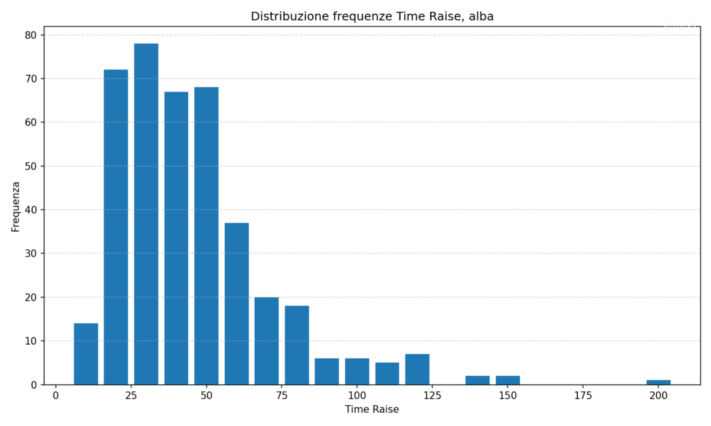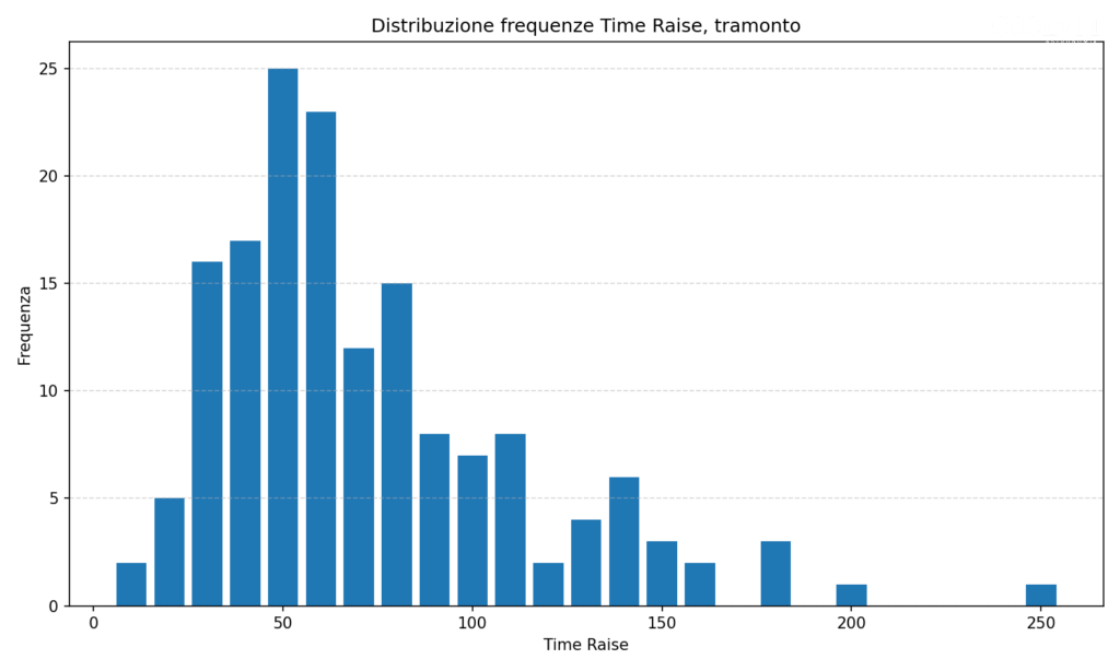- La distribuzione serale mostra una maggiore presenza di tempi di salita più lunghi.