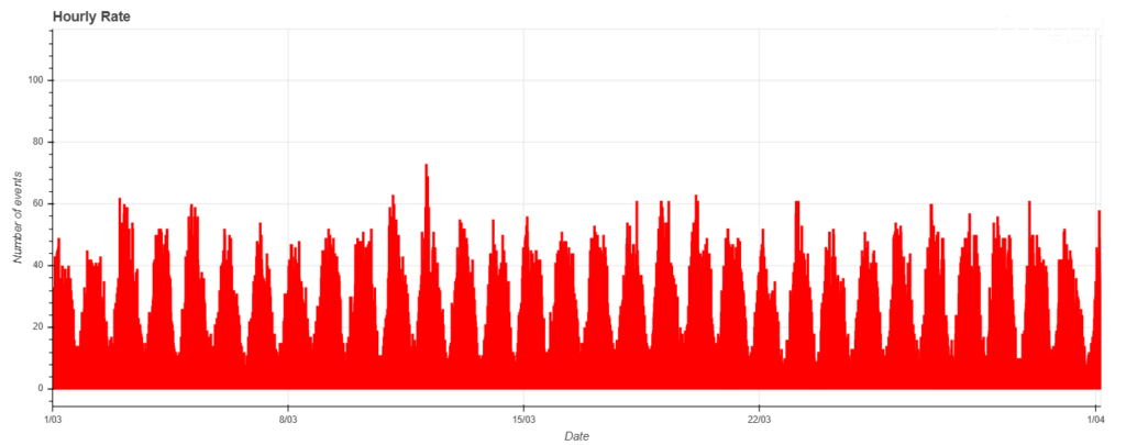 I grafici che seguono sono tratti da questa pagina: nelle ascisse è rappresentato il tempo, che è espresso in UT (Universal Time, Tempo Universale) oppure in longitudine solare (Solar Longitude) e le ordinate rappresentano il tasso orario (hourly rate), calcolato come il numero totale di eventi registrati dalla rete nell’ora diviso per il numero di ricevitori in funzione. La risoluzione temporale è di 15 minuti.