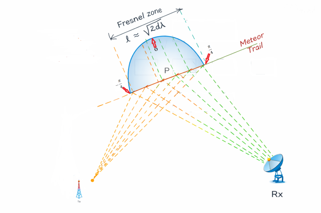 Consideriamo ora un tratto della traiettoria meteorica centrato nel punto P (vedi fig.2). Allontanandosi da P, il cammino ottico del segnale aumenta progressivamente aumentando il ritardo del segnale e ciò cambia la fase dell’onda ricevuta. I punti per cui questo ritardo di fase raggiunge λ/4 delimitano la cosiddetta “prima zona di Fresnel”, che rappresenta la regione efficace di interferenza costruttiva del segnale riflesso.
