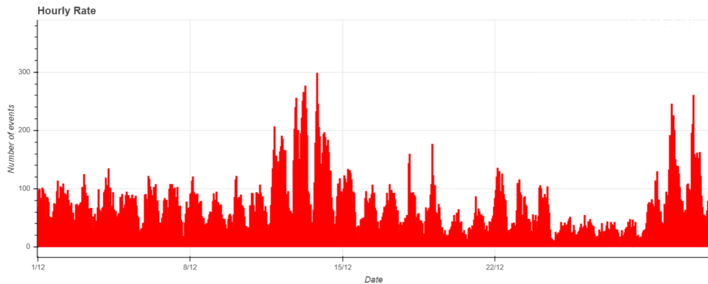 Visivamente si nota subito la differenza tra i due grafici dei tassi orari registrati (fig.5), dovuta non al numero di eventi registrati, ma al diverso metodo di campionamento temporale. Nel 2024 i tassi orari erano calcolati su intervalli di un’ora, mentre negli ultimi mesi di quest’anno la risoluzione è stata modificata in intervalli di 15 minuti. I picchi risultano quindi più stretti e meno mediati, ma l’intensità complessiva dello sciame delle Geminidi risulta comunque confrontabile con quella dello scorso anno, se integrata su base oraria (tenendo conto delle considerazioni fatte in precedenza sulle rilevazioni).