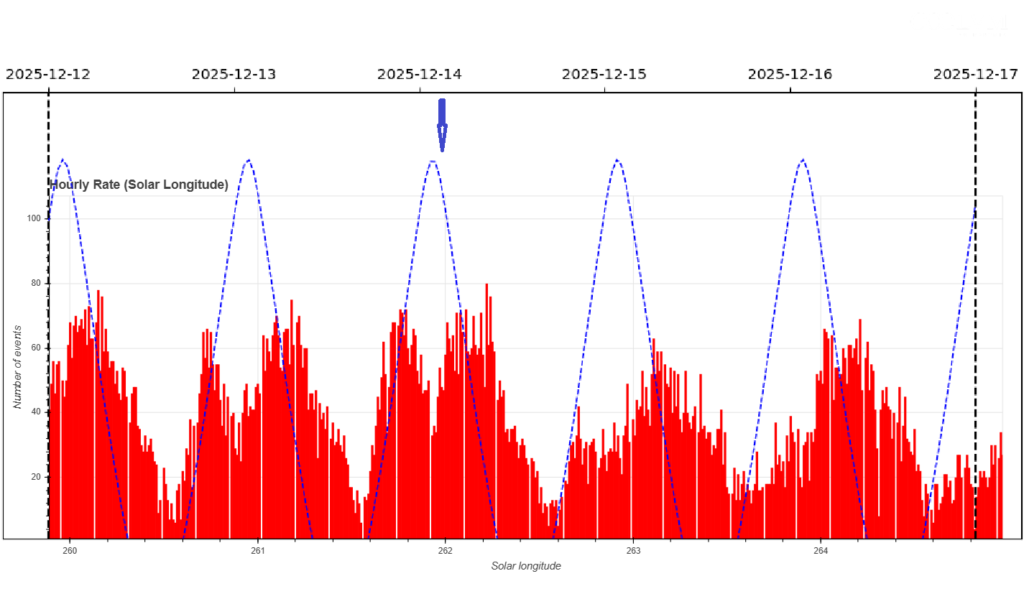 Hourly Rate) si è mantenuto costante con 120-150 meteore registrate all’ora e un picco di attività tra il 13 e il 14 dicembre.