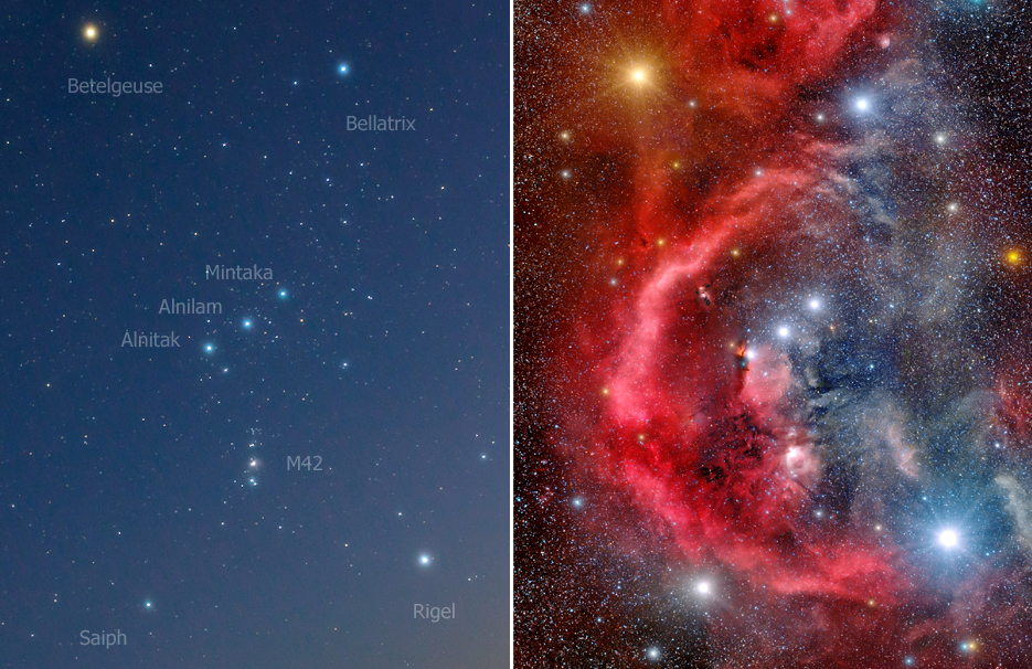 Vi rendete conto della differenza, dello sfolgorio di polveri e di gas che si cela nel buio in cui credevamo le stelle fossero avvolte? L’uso di una lunga posa, abbinata a particolari metodi di ripresa, rivela in questa immagine (per continuare con la metafora del giardino) il fitto intrico di arbusti su cui – visualmente – si appuntavano i fiori di Betelgeuse, Rigel, della Cintura, e anche quello della Grande nebulosa, l’unica porzione del sottobosco in qualche modo osservabile anche solo con l’aiuto di un binocolo…