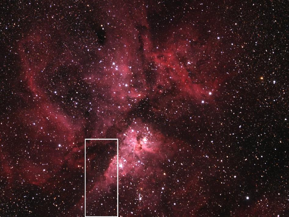 Anche questa bellissima immagine targata NASA è stata ripresa dal telescopio (rifrattore 3″ + camera CCD a colori) del Siding Spring Observatory in Australia del network iTelescope.net. Mostra 2012 DA14 mentre transita sulla nebulosa Eta Carinae. La traccia del NEO è evidenziata dal rettangolo bianco.