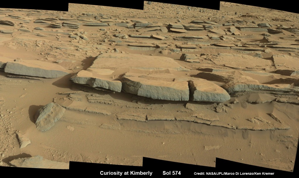 Dal sol (giorno marziano) 559 al sol 569, Curiosity ha adottato una nuova tabella di marcia guidando ogni giorno, anche se il 9 marzo la sonda della NASA Mars Reconnaissance Orbiter (MRO) è andata in safe-mode facendo perdere un giorno (sol 567, 11 marzo) di viaggio al rover. Kimberly è una regione particolarmente affascinante per i ricercatori perché formata da 3 piccoli tumuli, uno a sinistra e due all’estrema destra. Gli esperti alla guida del rover hanno notato una diversa risposta cromatica dei panorami ripresi con la MastCam in questa zona: sembra che ci sia una patina che ricopre il fondo e che non è presente sui promontori. Potrebbe trattarsi di una diversa concentrazione di sali minerali.