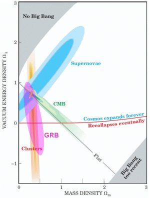 «In realtà sono “candele” standardizzabili. Nell’universo locale il processo di “standardizzazione” delle supernove-1a funziona, e non si hanno indizi che facciano ritenere che lo stesso non accada a redshiftpiù alti. Però, se vogliamo tornare ad una misura diretta dei parametri cosmologici, l’unico modo per circoscrivere e valutare l’azione degli errori sistematici è quello di cambiare la metodologia sperimentale fin qui adottata, basata, per l’appunto, sulle supernove-1a. In questo senso, l’utilizzo dei Gamma-Ray Bursts (GRB) per misurare Ωm, in modo indipendente dalle supernove-1a, è stato un passo importante. Sebbene la misura di Ωm ottenuta con i GRB sia ancora caratterizzata da barre d’errore molto grandi, il risultato ottenuto converge verso un valore di Ωm~ 0.3 e quindi confermerebbe il risultato trovato dalle supernove-1a nel 1998».