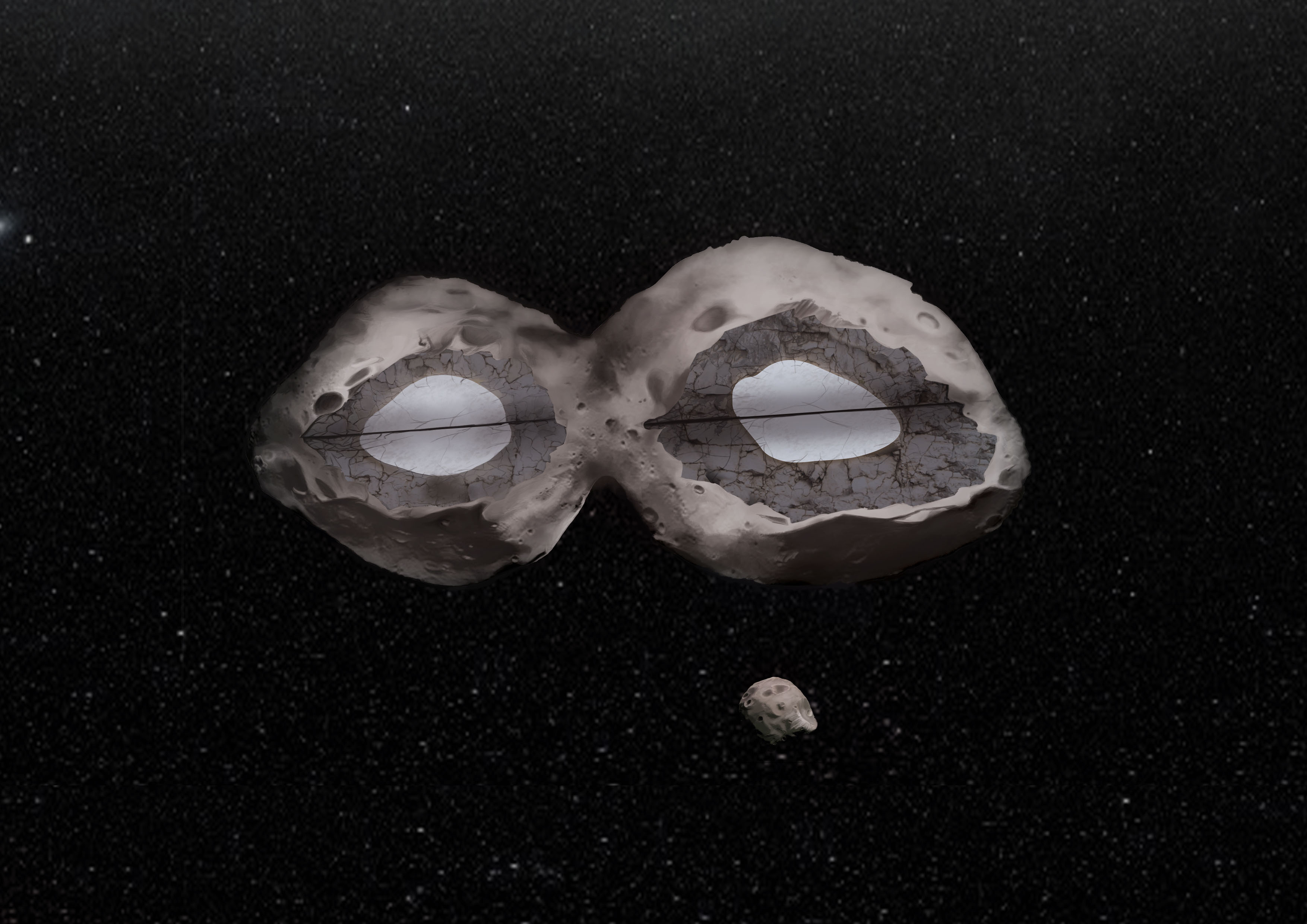 Lo studio, basato principalmente su osservazioni effettuate con il potente telescopio ad ottica adattiva del W. M. Keck Observatory alle Hawaii, suggerisce che l’asteroide e la sua luna possano essere il frutto di una collisione tra due asteroidi ghiacciati, catturati nella fascia di Kuiper dall’attrazione gravitazionale di Giove mentre il gigante gassoso ricollocava la propria orbita nel sistema solare, all’alba della sua formazione.