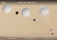 Le tre fasi della discesa del lander Schiaparelli da sinistra verso destra: entrata nell’atmosfera, discesa verso la superficie e atterraggio controllato che farà da test per la discesa del rover. Per questo motivo il lander è chiamato anche Entry Descent and Landing Demonstrator Module (EDM).La missione del 2016 fornirà informazioni cruciali: inanzitutto in che modo il lander si posizionerà su Marte.