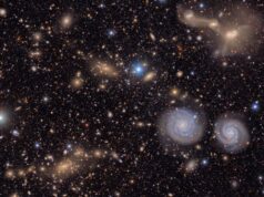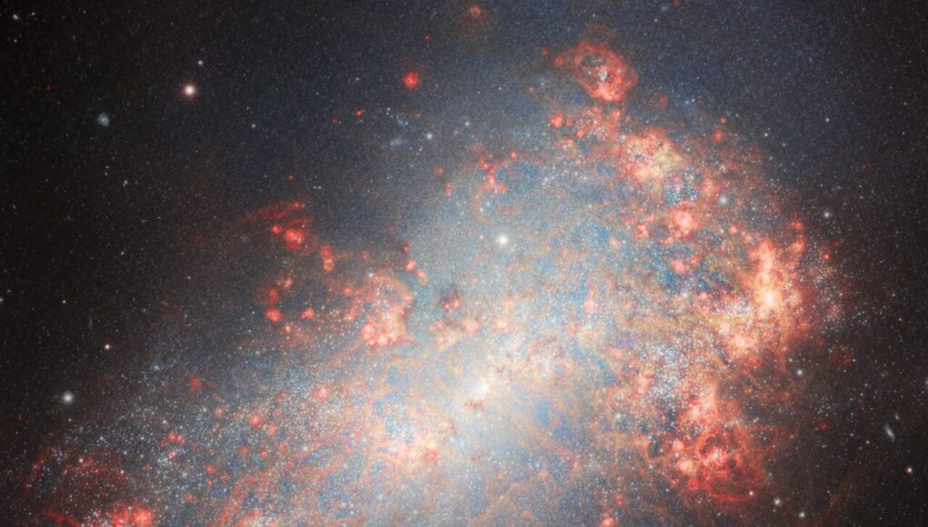 Una festosa gamma di rosa e blu brillanti crea uno spettacolo straordinario in questa immagine catturata con il telescopio Gemini North, metà dell’Osservatorio Internazionale Gemini. l’altra metà è il Gemini Sud. Simile a una nuvola di coriandoli cosmici, questa immagine è stata rilasciata per celebrare il 25° anniversario di Gemini North. NGC 4449 è un ottimo esempio di attività starburst causata dall’interazione e dalla mescolanza delle galassie mentre la maggiore assorbe lentamente le sue vicine galattiche più piccole.