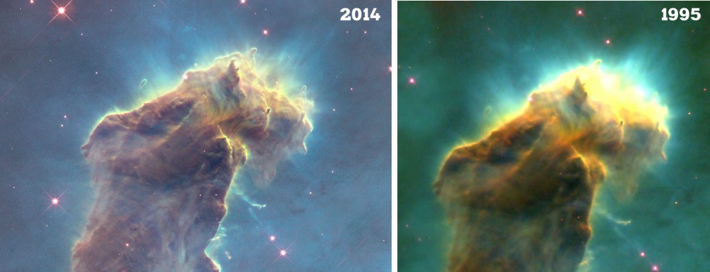 Happy Birthday, Hubble! Il telescopio più famoso del mondo, dopo quello di Galileo del 1609, messo in orbita nel 1990, compie tra poco un quarto di secolo di splendido servizio. La NASA lo festeggia in modo elegante: ripropone la immagine più famosa della galleria cosmica di Hubble, ripetuta e migliorata. Si tratta dei famosissimi “Pillars of Creation”, i Pilastri della Creazione che, visti da Hubble nel 1995, fecero subito il giro del mondo, stampati su T-shirts come su tazze da caffè (americano, viste le dimensioni dell’immagine). Adesso la NASA ne pubblica una seconda immagine, appena fatta, più profonda e più bella.