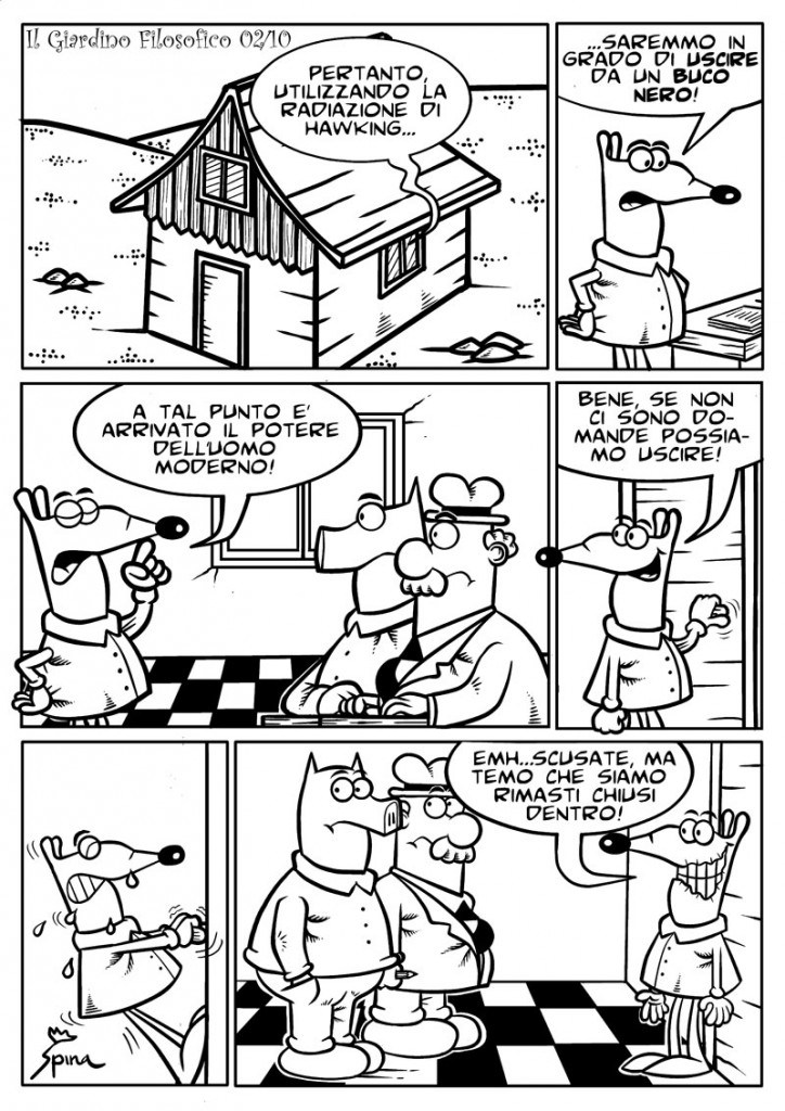 Hawking adesso propone una terza soluzione. Il famoso orizzonte, almeno in qualche caso, non è una barriera insormontabile. La ragione sono le “fluttuazioni quantistiche dello spazio-tempo” (concettino non semplice, ammettiamolo) che ogni tanto passano. Ma allora, se in qualche caso l’orizzonte del buco nero è valicabile dall’interno, il concetto di “buco nero” scompare: non solo non è un buco, ma non è neanche nero… Però quello che potrebbe uscire è tutto diverso da quello che è entrato, irriconoscibile come il testo della Divina Commedia nel mucchietto di ceneri nel quale l’abbiamo bruciata. Per non parlare del laureando.
