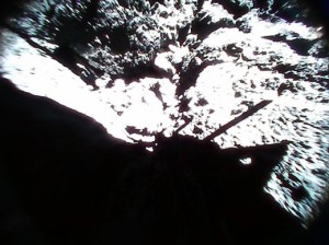 I Minerva-II non potranno mandare “selfie” ai quali missioni NASA, come quelle dei rover Curiosity o Opportunity, ci hanno abituato, sono letteralmente delle scatole di biscotti con delle antennine per trasmettere informazioni e delle barre per stabilizzare il loro movimento e proteggere dagli urti i pannelli solari preziosi il loro funzionamento, non hanno bracci automatici o altri appendici più complesse e mobili… ma nonostante questo ecco qui sotto una sorta di selfie in arrivo da 1A, la sua inequivocabile ombra proiettata sulla superficie dell’asteroide: