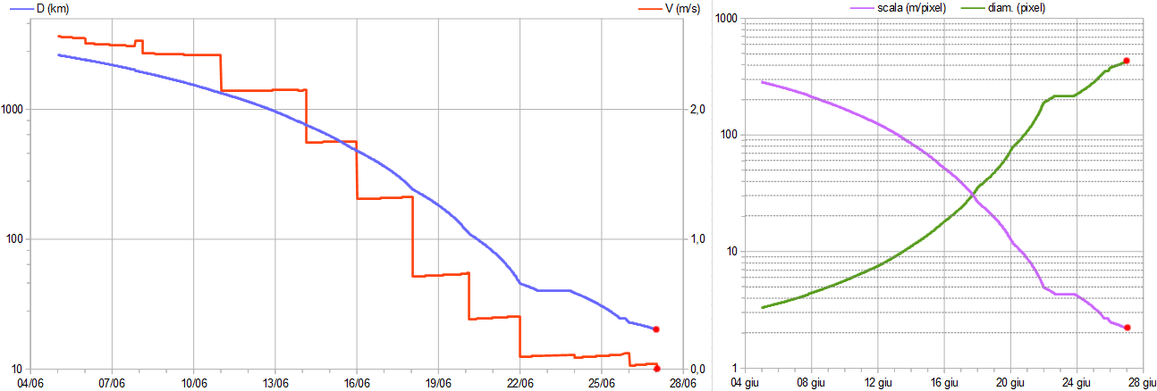 Infine, qui sotto, i grafici della distanza e della velocità relativa relative all’intera fase di approccio (riportati anche nel Mission Log); a destra anche l’andamento delle dimensioni apparenti dell’asteroide e della scala delle immagini riprese dalla fotocamera telescopica ONC-T. I gradoni orizzontali non sono realistici e derivano da buchi temporali nei tabulati ufficiali di JAXA, presumibilmente dovuti a revisioni sui valori di distanza realmente rilevati, discrepanti rispetto al modello precedente.