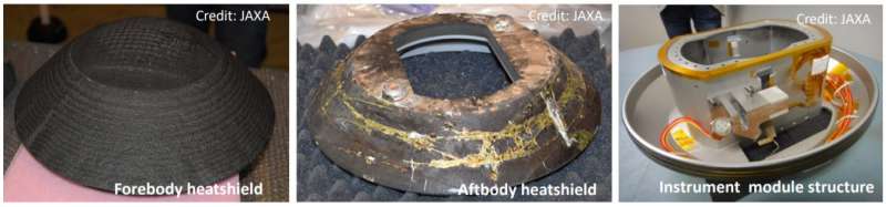Sono passati 2,5 mesi dall’arrivo della capsula nel deserto di Woomera, in Australia, ma l’analisi dei campioni è ancora al principio. Qui sotto vediamo i vari pezzi della capsula: a sinistra lo scudo termico frontale, al centro la parte posteriore (apparentemente malandata) e a desta il modulo strumentale posto tra i due. Insieme al paracadute e all’elettronica di controllo, nei giorni scorsi, questi tre elementi sono stati esposti al pubblico, nel museo cittadino di Sagamihara; presto verranno spostati al National Science Museum.