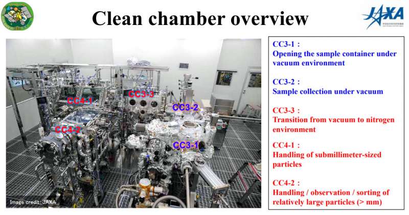 Di seguito vediamo la “camera pulita” dedicata a tali delicate analisi. Si tratta praticamente di un laboratorio completamente isolato dall’esterno, con cinque differenti comparti dedicati alle varie fasi della lavorazione. Il contenitore cilindrico contenente i campioni è stato prima aperto in condizioni di vuoto nella camera CC3-1, rimuovendone il coperchio e rivelando il contenuto della “Chamber A”; i campioni in essa contenuti dovrebbero essere quelli raccolti nel primo touchdown. Una parte di questo materiale è stato rimosso e stivato sottovuoto, per poi spostare il cilindro nello scomparto CC3-3, aprendo progressivamente le tre camere in un ambiente saturo di azoto.