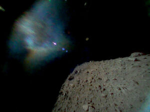 L’immagine mostra la superficie di Ryugu (sulla sinistra), registrata durante un salto compiuto dal rover. A destra si nota un riflesso dovuto alla luce solare.